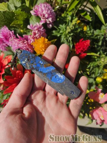 This is a beautiful, handcrafted Damascus steel pocket knife featuring a premium woolly mammoth tusk ivory handle. It has striking blue accents made from genuine blue topaz.
